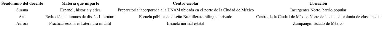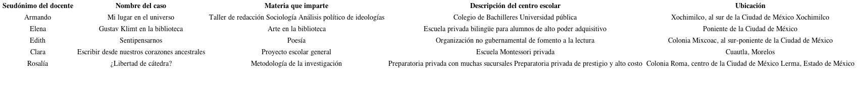 Para ello, recurrimos al estudio de caso de cinco docentes de muy diversa índole, tanto por su área de trabajo como por sus actividades, objetivos y contenidos disciplinares. Son docentes de educación básica, media, media superior y de educación no escolarizada, que fueron seleccionadas porque sus ex alumnos habían sido reconocidos por profesores de educación superior como alumnos excepcionales en sus clases. En este caso, elegimos profesores que no fueran de lengua, pero que practicaran la literacidad crítica dentro de su disciplina; esto, para evidenciar que su uso no se circunscribe a las materias que tienen que ver con el uso de la lengua en específico.