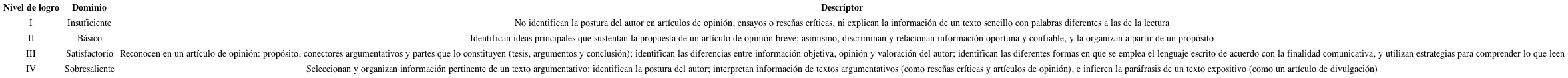 Para el análisis de los resultados, la evaluación toma como referentes cuatro niveles de logro, que son acumulativos; es decir, los estudiantes que se encuentran en el nivel II ya poseen los aprendizajes del nivel I (ver Tabla 1).