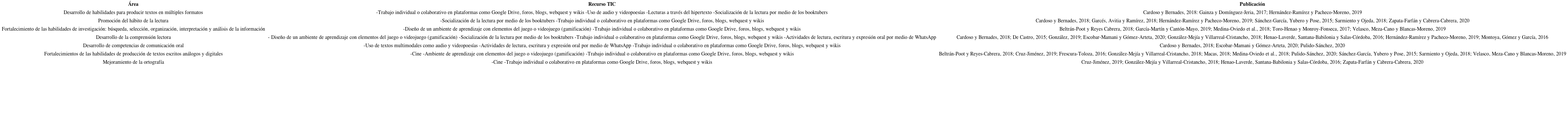 El objetivo de los trabajos de investigación referidos es atender diferentes necesidades educativas identificadas: falta del hábito lector, bajo nivel de comprensión lectora, problemas para expresar ideas de forma oral y escrita, y deficiencia en las habilidades de producción de textos escritos, y considerar las posibilidades que ofrecen las TIC en el contexto educativo. De esta manera, es posible determinar las áreas de lectura y escritura sobre las cuales, de acuerdo con los resultados de los estudios analizados, se evidencian los efectos positivos de utilizar las TIC como herramientas educativas en el proceso de enseñanza-aprendizaje (ver Tabla 5).