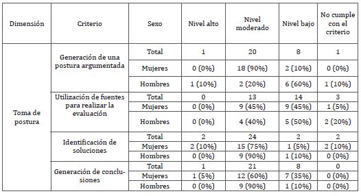 En la toma de postura hay un posicionamiento por parte de los estudiantes que retoma argumentos vinculados a la temática; no así, contrargumentos. Clavijo (2010) explica que no hay una sola posibilidad de argumentos, sino una amplia gama que permite ir más allá del pensamiento dogmático. Es menester indicar que se ha observado que pocos son los estudiantes que se ubican en un nivel alto de pensamiento crítico, lo que es similar a lo encontrado por Olivares y Heredia (2012).