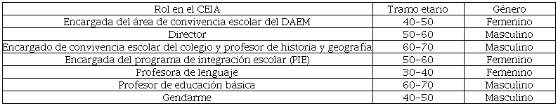 Respecto a la elección del establecimiento educativo, realizamos un muestreo de caso revelador (Martínez-Salgado, 2012) y buscamos un CEIA que permitiera aumentar el conocimiento en torno al tema. Aplicamos entrevistas en profundidad (Amezcua, 2015), con un total de siete participantes. Cada persona entrevistada llevaba al menos un año en su cargo; el propósito era encontrar diversidad de materias dictadas, cargos y género. En las entrevistas se abordó la historia profesional, la trayectoria en el CEIA, la experiencia subjetiva en torno a convivencia escolar, prácticas cotidianas y expectativas y tensiones sobre las políticas de convivencia escolar; todo ello fue articulado en la pregunta global por los significados sobre convivencia escolar en este contexto en particular. El proceso de producción de información finalizó con la saturación de esta (Martínez-Salgado, 2012). La tabla 1 muestra la caracterización de los participantes del estudio.