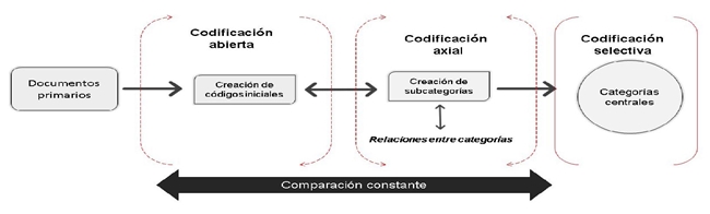 La información recabada se analizó mediante la técnica de comparación constante (Glasser & Strauss, 1967). El procedimiento consistió en la codificación de la información de las transcripciones de los grupos focales. Para ello, utilizamos el programa ATLAS.ti7. Como primer paso, procedimos a construir la unidad hermenéutica con los documentos primarios (transcripciones). Luego, a la codificación en tres etapas (ver figura 1), en las que los textos se leyeron en profundidad; después, seleccionamos segmentos de información para categorizarlos de manera inductiva (codificación abierta) e identificar relaciones entre las subcategorías emergentes (codificación axial) y, por último, elegir las categorías centrales (codificación selectiva).