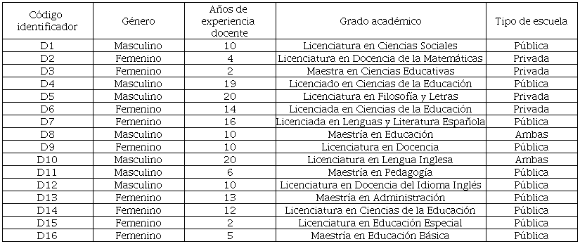 El estudio contó con 16 docentes, cuyas características pueden observarse en la tabla 1. El muestro fue por conveniencia, dado que el acceso a los participantes se encontraba limitado debido a la suspensión de labores escolares. La captación de participantes fue mediante una convocatoria publicada en marzo de 2020 en redes sociales.