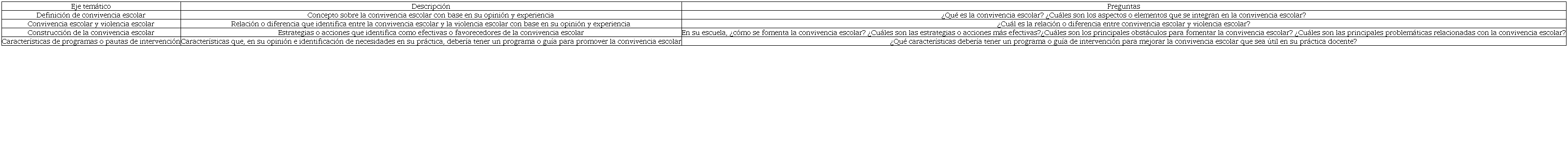 Para recabar la información, se emitieron las preguntas contenidas en la guía de entrevista semiestructurada (ver apéndice) elaborada de acuerdo con el propósito de la investigación de la que forma parte este estudio: analizar y describir las experiencias y conceptualizaciones de los docentes sobre convivencia escolar. Estas preguntas se enunciaron a partir de cuatro ejes temáticos: definición de convivencia escolar; convivencia escolar y violencia escolar; construcción de la convivencia escolar; y características de programas o pautas de intervención, los cuales se formularon con base en la revisión de literatura referente a los enfoques sobre convivencia escolar. Cabe señalar que, aunque las preguntas no pretenden indagar las experiencias en el contexto de pandemia, los relatos de los docentes expresaron sus vivencias en este escenario.