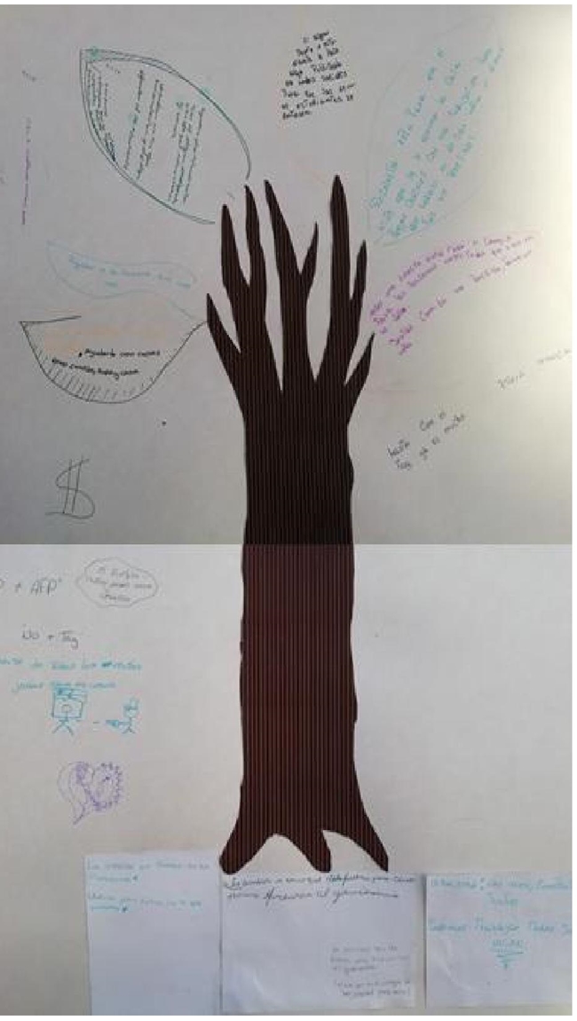 La segunda sesión hizo hincapié en identificar, a través de la figura de un árbol, las fortalezas y los recursos reconocidos por los estudiantes para hacer frente a la crisis. Estos fueron ubicados en las raíces del árbol. Este ejercicio permitió formular propuestas para afrontar colectivamente y desde la experiencia escolar la situación de crisis. Estas propuestas fueron ubicadas como hojas en las ramas. Se utilizó el método gráfico de árboles (Harden et al., 2000) con la finalidad de desarrollar un producto que permitiera poner en práctica la capacidad del alumnado de opinar libre, respetuosa y en conjunto.