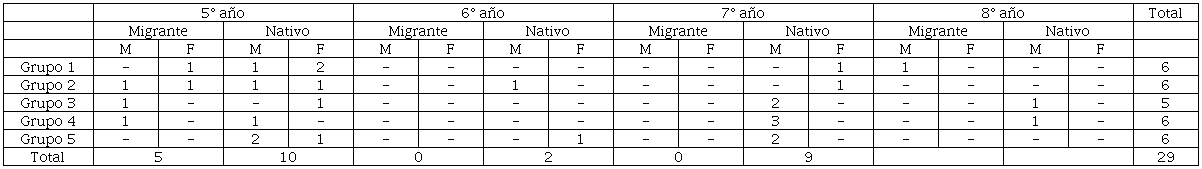 En este estudio específico participaron 29 estudiantes de segundo ciclo de enseñanza primaria (de 5º a 8º grado), quienes aceptaron participar voluntariamente; se formó un grupo heterogéneo en función de género y condición de migrantes o nativos (ver tabla). Los participantes fueron distribuidos en cinco grupos para la organización de un taller participativo de dos sesiones.