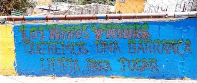 Algunas actividades documentales que hemos realizado son dibujos y videos de sus sueños y deseos para la barranca, murales, intervenciones en el puente de colores, y un río pintado que baja por las escaleras infinitas de estas colonias. Todos estos visibilizan el sentir y la propuesta de futuro del grupo de ecoguardas e influyen en las acciones de los adultos. La siguiente foto es un mural con un mensaje simple y claro: