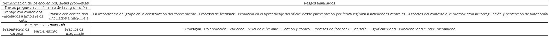 Como podemos inferir, en la secuencia de los encuentros observados advertimos que en los tres momentos descritos se llevaron a cabo instancias de aprendizaje teóricas y prácticas. A continuación, abordaremos los rasgos de las tareas propuestas durante la capacitación en maquillaje y analizaremos las características de las instancias evaluativas ofrecidas en ese espacio de formación para el trabajo.