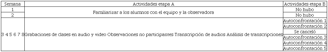 El diseño de la investigación se realizó en dos etapas denominadas A y B, que sucedían de forma casi simultánea. La A consistió en la recolección de datos en el aula; se hicieron grabaciones en audio y video de las clases de español, así como observaciones no participantes. Una observadora (distinta a la investigadora) permaneció dos meses en el aula. Las primeras dos semanas familiarizaron a los alumnos con la videocámara y la presencia del agente externo. La función de la observadora era encargarse del equipo de grabación (prenderlo, moverlo cuando fuera necesario, verificar que estuviera grabando y apagarlo), tomar notas de las actividades de la profesora -sobre todo de aquellas que podrían escapar del video- y consultar la planificación de la maestra para registrar los objetivos de enseñanza de las clases observadas.