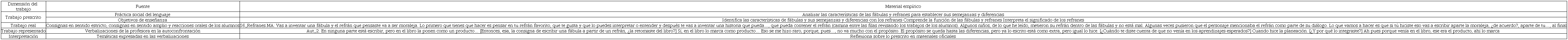 En la clase observada (Aut_2), los alumnos eligieron su refrán favorito y, luego, inventaron una fábula en la cual ese refrán era la moraleja. El trabajo en la clase se desarrolló individualmente y sin hacer preguntas a la profesora, pero cuando los niños y las niñas leyeron sus fábulas en voz alta, estas no cumplían con lo solicitado. Los textos tenían un refrán y algunas características de la fábula, pero no había moraleja. El refrán no era una enseñanza derivada del texto. La profesora recogió los escritos para revisarlos después de clase y finalizó la sesión.