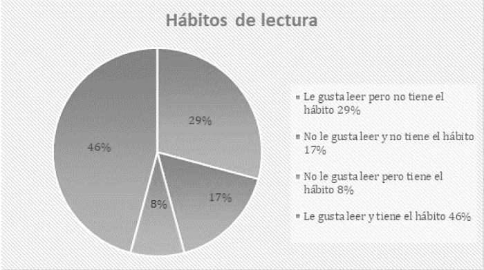 En la encuesta diagnóstica, el 75% de los participantes (18 de 24) afirmaron que no les gustaba leer. No obstante, al preguntar si tenían el hábito lector, contestaron lo que mostramos en la gráfica 1. Menos de la mitad ejercitaba la lectura y quienes respondieron que tenían el hábito leían máximo dos horas a la semana, lo cual evidencia su desconocimiento sobre el significado de hábito lector. El 29% que respondió que no le gustaba leer, al finalizar la intervención uno reafirmó su disgusto por la lectura, dos dejaron de asistir y tres modificaron su respuesta a “les gusta leer”.
