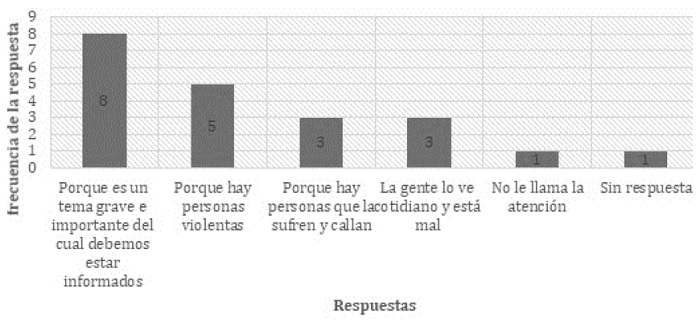 El discurso sobre la violencia estuvo presente en siete sesiones en textos de autores como Felipe Rodríguez, Horacio Castellanos Moya, entre otros, con la finalidad de desnaturalizar y comprender la violencia mediante la expresión, la reflexión y el diálogo. En dos de las sesiones implementamos la reflexión escrita; en las siete, el diálogo y la reflexión oral; y en cuatro se identificaron los tipos de violencia y las ideologías en los discursos: 22 de 24 jóvenes consideraron importante hablar sobre este tema, y expresaron sus razones (ver gráfica 2).