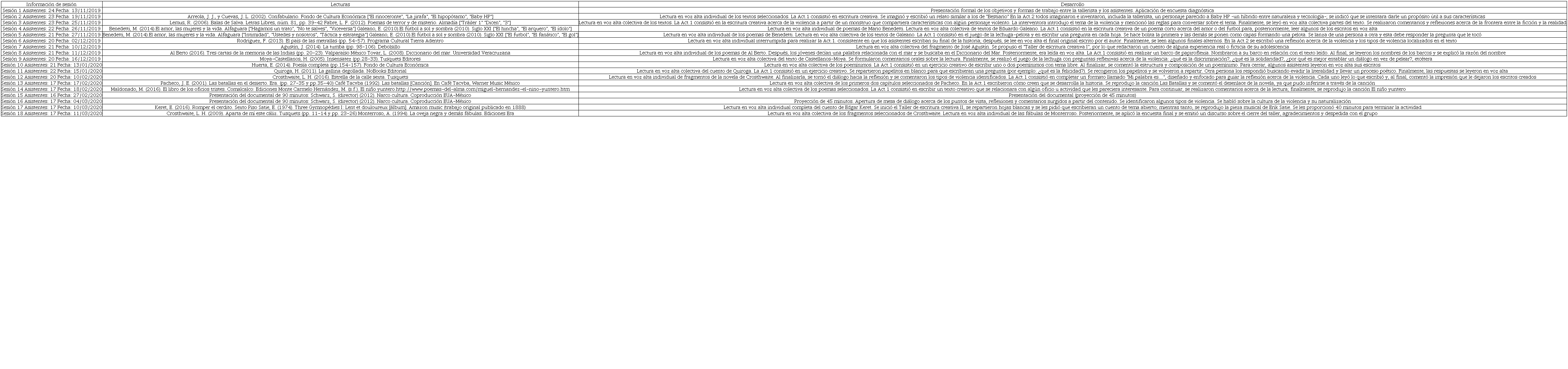 La intervención se desarrolló de noviembre de 2019 a marzo de 2020, y comprendió 18 sesiones presenciales, las cuales fueron realizadas en el salón de clases. Por lo general, al iniciar la sesión se leía en voz alta el texto correspondiente. Después, se efectuaba una actividad relacionada con lo leído; al final, se compartía el resultado del ejercicio. Cada dos sesiones de textos de literatura -en los que predominaba la literatura universal-, se intercalaba uno relativo a la violencia a fin de no afligir a los jóvenes con las otras lecturas; siempre se alentó a la reflexión y discusión sobre los temas tratados.
