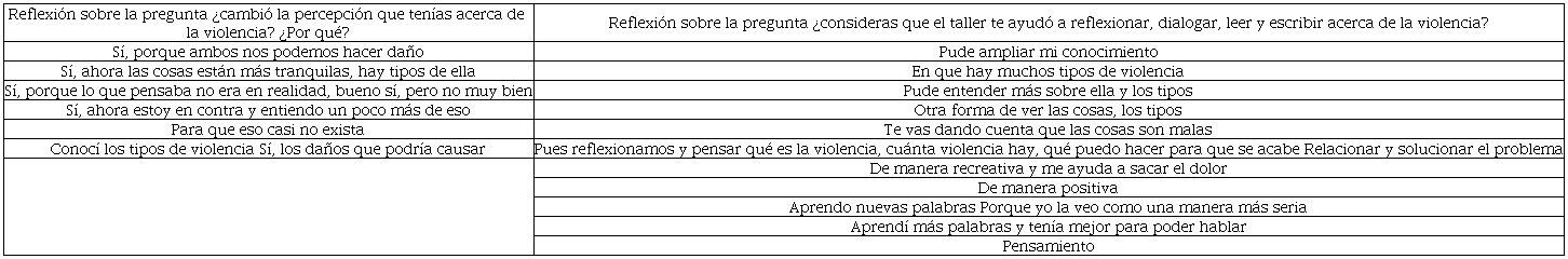 Las actividades desarrolladas en cada sesión propiciaron el sentido y el significado de los textos; se incentivó la expresión, la reflexión y el diálogo que permitieron comprender el fenómeno de la violencia y eliminar, así, el significado de “acción natural”. Las lecturas compartidas tienen como particularidad formas transgresoras con hechos ciertos que se abordan desde la lectura estética (Morales, 2019). Alternar un texto sobre violencia por cada dos de literatura universal fue un acierto. Resalta, además, las diferencias de opinión por género, aunque al final existió unanimidad al expresar tener una mejor comprensión sobre el fenómeno y, ante todo, a decir “no a la violencia”.