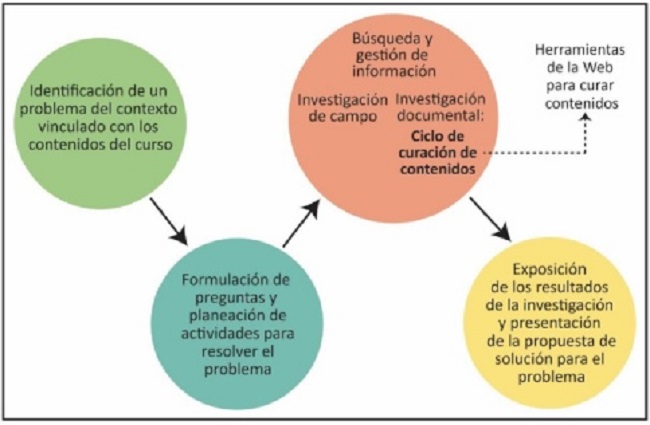 Esta estrategia didáctica de investigación formativa destaca la gestión de información digital proveniente de internet con actividades de curación de contenidos, en congruencia con la dinámica de la investigación en la actualidad. La curación de contenidos es una actividad surgida en el ámbito del social media, que puede ser entendida como el proceso de recolectar, organizar, interpretar, resumir y compartir recursos de internet por aprendices de un tema (Ostashewski, Brennan & Martin, 2014). Los recursos son aquellos que se consideren los mejores y más relevantes, y su publicación es acompañada de breves textos propios que reflejan una reflexión sobre lo que se está compartiendo. Una regla de oro es dar el debido crédito al autor de la publicación original, lo cual, de entrada, no da cabida al llamado ciberplagio. Al igual que con las obras de arte de una exposición, se requiere un análisis que relacione el tema de interés con el contenido de la obra para decidir si incluirla o descartarla de la colección. El acto de compartir es sumamente importante, pues da pie a que otras personas retroalimenten lo publicado y que se dé la reflexión y la argumentación (Wolff & Mulholland, 2013).
