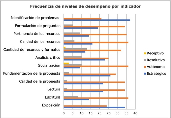 Los niveles más altos de desempeño, el autónomo y el estratégico, fueron los más frecuentemente logrados en todos los indicadores, a excepción de la socialización y cantidad de recursos, en los que el nivel resolutivo superó al autónomo de manera ligera. En los únicos indicadores en los que se registró el nivel más bajo, el receptivo, fueron los de socialización (3 de 58) y en cantidad de recursos y formatos (1 de 58). Aunque estos resultados en los dos indicadores fueron muy poco representativos coincidieron en tener la más baja incidencia del nivel más alto, el estratégico, por lo que no dejan de requerir atención.