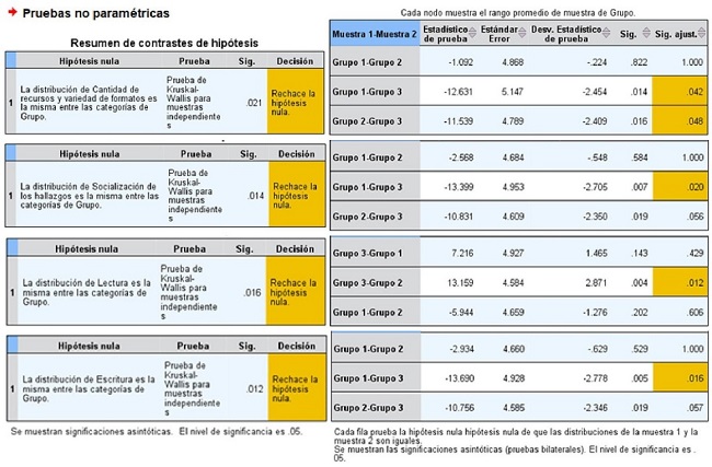 La prueba H de Kruskal-Wallis reconoce solo los casos en que los grupos son significativamente distintos, pero no arroja información sobre cuáles son esos grupos. Para identificarlos, aplicamos pruebas post-hoc y encontramos que en los cuatro casos el grupo 3 presenta una diferencia estadística significativa en relación con el grupo 1, con el 2, e incluso con ambos. En específico, los resultados de las pruebas indican que el grupo 3 difiere de los grupos 1 y 2 en cuanto a cantidad de recursos y formatos; del grupo 1 en socialización; del grupo 2 en lectura; y del grupo 1 en escritura. En la figura 2 se muestran los resultados de las pruebas post-hoc que permitieron ubicar estas diferencias.