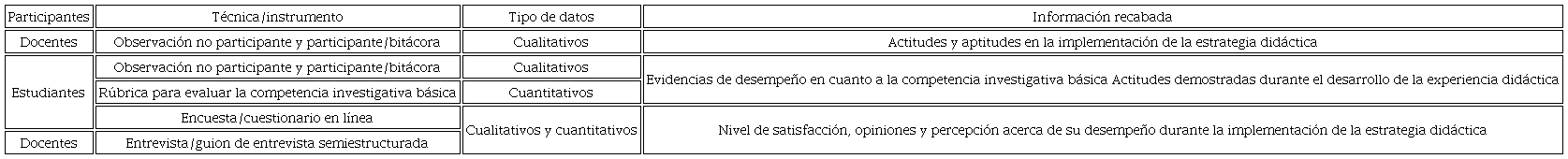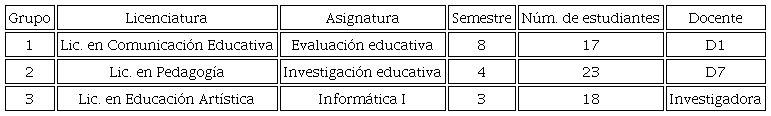 El muestreo fue no probabilístico e intencional. De acuerdo con Izcara-Palacios (2014), la muestra debe presentar dos características: una riqueza de información sobre el objeto de estudio y una evidente disposición para cooperar con el investigador. De entre la amplia tipología de muestreo intencional presentada por este autor, consideramos que el muestreo para esta investigación recae en dos tipos: muestreo de conveniencia y muestreo según determinados criterios. Estos fueron la disponibilidad de los docentes para participar y el desempeño que tuvieron durante el taller en el que se abordaron las temáticas relacionadas con la estrategia didáctica. También fue relevante -y congruente con el método de investigación adoptado- observar un grupo de manera participativa, lo cual implicó colocarse en una situación similar a la de los otros docentes y efectuar las mismas actividades que las situaciones observadas (Bisquerra, 1996); es decir, dos de los grupos con los que se implementó la estrategia fueron atendidos por docentes que tomaron el taller y uno por la investigadora que lo impartió. Los detalles de cada grupo se presentan en la tabla 1.