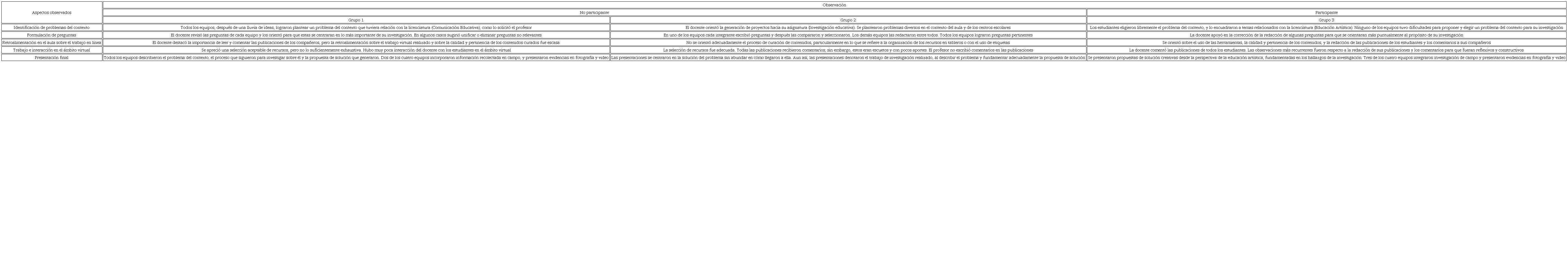 La observación fue una técnica aplicada en las tres experiencias de implementación documentadas. Observamos de manera no participante a dos grupos y participante a uno de los grupos a fin de recabar información sobre el desarrollo de la estrategia, así como el desempeño de docentes y estudiantes. En los tres grupos, las observaciones tuvieron lugar tanto en el ámbito presencial como en el virtual, mediante grabación de audio y registro escrito en una bitácora. En el entorno presencial observamos las actividades relevantes para la investigación, como la conformación y organización de los equipos, la identificación de problemas del contexto, la formulación de preguntas, la retroalimentación en el aula sobre el trabajo en línea, y las presentaciones de los equipos del informe final de la investigación en las que los estudiantes expusieron sus hallazgos y propuestas de solución a los problemas abordados. En el ámbito virtual observamos los diferentes momentos de los procesos de curación de contenidos.