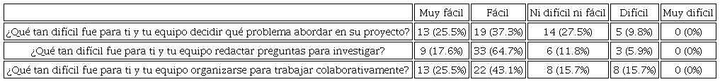 El punto de vista de los estudiantes acerca de la estrategia didáctica fue, en términos generales, muy positivo. Como advertimos en la tabla 4, en las preguntas del cuestionario en línea sobre la facilidad para plantear un problema del contexto, redactar las preguntas para investigar y organizarse para trabajar en equipo, el porcentaje mayor se situó entre fácil y muy fácil. Al pedirles una respuesta extendida, quienes marcaron la opción “difícil” señalaron dificultades para ponerse de acuerdo con sus compañeros en la elección del tema de su proyecto. En su mayoría, refirieron no haber tenido dificultades para redactar preguntas de investigación; sin embargo, presentaron cierta dificultad para formular preguntas con el nivel de profundidad necesario para construir conocimiento respecto al problema del contexto. La intervención del docente en este punto fue fundamental, al orientar en la selección de las mejores preguntas y reformular aquellas que requerían ajustes. La importancia otorgada a las preguntas en el transcurso de las actividades del proyecto resaltó su papel principal como guía de la investigación: se recurrió a las preguntas para planear el proyecto, buscar información, analizarla y organizarla, así como para formular la propuesta de solución.