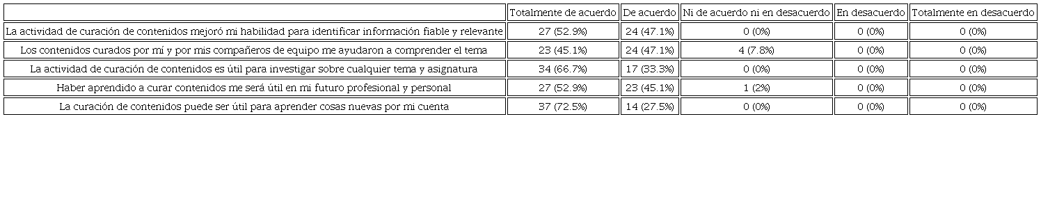 Por lo que toca a la utilidad que encuentran en la curación de contenidos para su futuro profesional y personal, reiteradamente mencionaron que la curación de contenidos ayuda a hacer una mejor selección de fuentes y recursos, lo cual les permitirá hacer trabajos de mejor calidad; apuntaron que les será útil no solo en los trabajos de la escuela, sino para resolver todo tipo de problemas que se les presenten en el futuro. La tabla 5 muestra una parte de los resultados globales de esta sección del cuestionario.