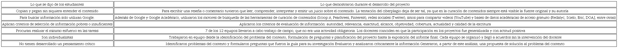 Durante la fase de diagnóstico que precedió a la implementación de la estrategia didáctica se registraron algunas percepciones de los docentes respecto a sus estudiantes, que resulta interesante contrastar con lo observado en la implementación de la estrategia didáctica. En la tabla 6 se muestra esta comparación.