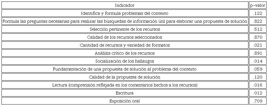 A fin de determinar la consistencia de los resultados de las evaluaciones de las tres implementaciones, por tratarse de datos ordinales y no continuos, se aplicó la prueba no paramétrica H de Kruskal-Wallis, que permite determinar si las muestras provienen de una misma población o poblaciones de idéntico comportamiento; en este caso, si el nivel de desempeño en cuanto a la competencia investigativa básica varía significativamente dependiendo del grupo en el que se cursó el módulo. Los resultados de la prueba se resumen en la tabla 7, en la que destacan los cuatro casos en que los resultados son significativamente distintos al menos entre dos de los grupos, dado que el p-valor es menor que 0.05 (nivel de significancia).