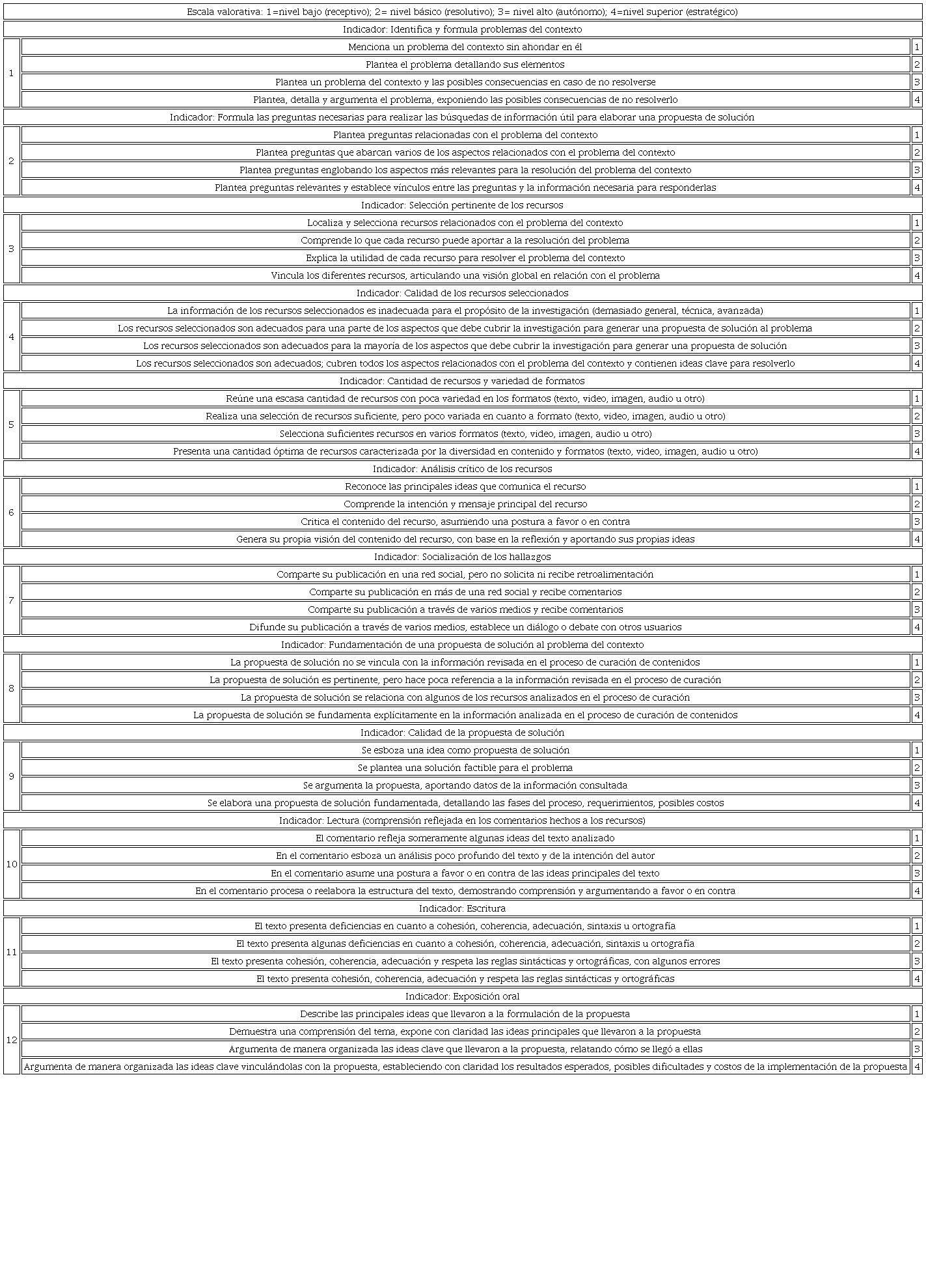 La rúbrica para evaluar la competencia investigativa básica fue elaborada desde la perspectiva socioformativa (Hernández, Tobón y Guerrero, 2016; Tobón, Pimienta y García, 2010; Tobón, 2012; Tobón, 2014) y prevé 12 indicadores: identificación y formulación de problemas del contexto; planteamiento de las preguntas necesarias para realizar las búsquedas de información útil para elaborar una propuesta de solución; selección pertinente de los recursos; calidad de los recursos seleccionados; cantidad de recursos y variedad de formatos; análisis crítico de los recursos; socialización de los hallazgos; fundamentación de una propuesta de solución al problema del contexto; calidad de la propuesta de solución; lectura (comprensión reflejada en los comentarios hechos a los recursos); escritura; y exposición oral. La escala de evaluación corresponde a los niveles de desempeño para evaluación de competencias: receptivo, resolutivo, autónomo y estratégico. Este instrumento fue sometido a un proceso de validación, para lo cual recurrimos a un panel de expertos.