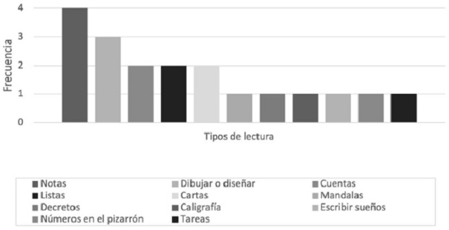 La gráfica 2 demuestra que todos ellos tienen o crearon sus literacidades vernáculas, ya que cuatro escriben notas, tres utilizan la escritura para diseñar o pintar, hacer cuentas, listas, cartas, decretos, etcétera, y estas son creaciones personales no impuestas por las instituciones, lo cual vuelve interesante comprender que estos lectores ya tenían un acercamiento a lo letrado, sin saberlo quizá, pero llegaron a estos espacios de escritura. No obstante, según sus respuestas, ellos no creían que escribir algo no relacionado con escribir literatura fuera escribir.
