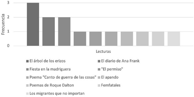 Sin duda, este apartado es uno de los más importantes, ya que muestra de manera clara que la apropiación de una misma lectura no es igual para todos los participantes de un conglomerado que forma parte de un taller de lectura. A pesar de que el texto que tuvo más resonancias en los participantes fue el libro-álbum El árbol de los erizos, advertimos que no tuvo una diferencia significativa de menciones, sino que de los 11 participantes se eligieron textos diferentes, y se tuvo en segundo lugar como lecturas-espejos El Diario de Ana Frank y Fiesta en la madriguera.