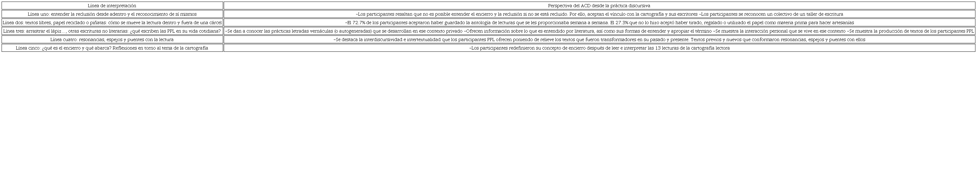Una vez mencionadas las cinco líneas de interpretación, presentamos la tabla 3 con las dimensiones críticas encontradas en las literacidades de los participantes. Para el análisis crítico del discurso (ACD), destacamos la relación entre texto, discurso, aspectos sociales y significación. Tomamos como base las bitácoras producidas por los participantes. En estos textos se plasmaron las reflexiones de cada persona respecto al texto, su convivencia y autorreconocimiento, los cuales permiten acercarse a la complejidad de residir en las instituciones totales, como son los centros penitenciarios.