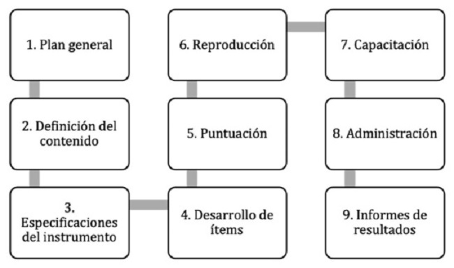 En la figura observamos que, para la consecución de la primera etapa del estudio, hicimos una adaptación de la propuesta de Lane y colaboradores (2016) para la construcción de instrumentos de evaluación, la cual considera los criterios de calidad de los estándares de la American Educational Research Association/American Psychological Association/National Council on Measurement in Education (AERA/APA/NCME) (2014).