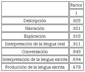 La aplicación del AFE permitió determinar la unidimensionalidad del constructo medido, cuyo único factor explica el 76% de la varianza de los ítems (ver gráfico). Con estos datos se demuestra que todos los ítems forman parte de un mismo constructo latente sobre lenguaje y comunicación.