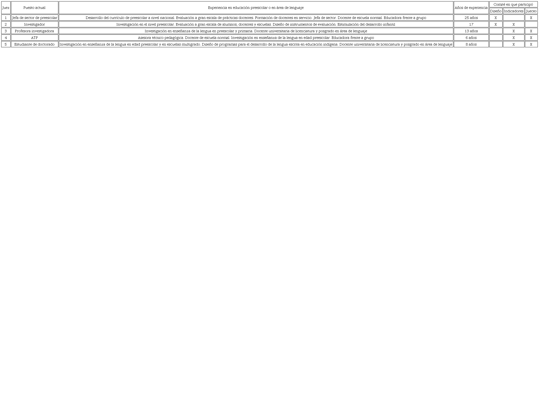 Comité de jueceo de diseño. Compuesto por dos expertos con amplia experiencia en el nivel preescolar: uno en investigación y evaluación educativa y otro con conocimiento del currículo y las prácticas educativas.