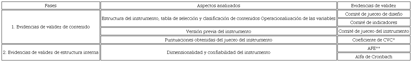 El procedimiento se conformó de dos grandes etapas que se desarrollaron en forma paralela. La primera estuvo dedicada a la construcción del instrumento de evaluación; y la segunda, orientada a la obtención de evidencias de validez basadas en el contenido y la estructura interna.