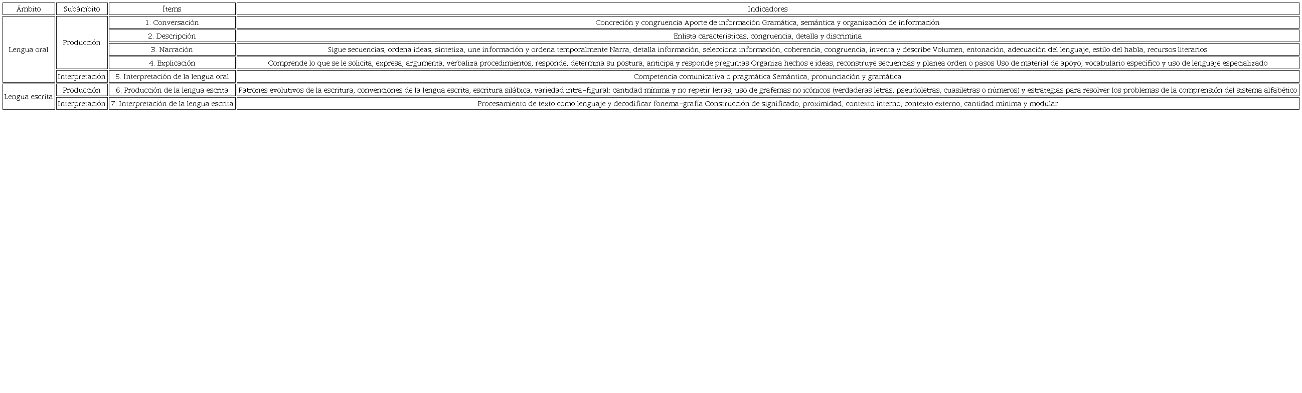 Esta rúbrica es un instrumento para evaluar el desempeño de niños y niñas de preescolar en el campo de lenguaje y comunicación de la lengua materna español, referido al currículo con fines formativos y monitoreo de tendencias. La educadora frente a grupo es quien valora el desempeño del instrumento con las pautas del manual de aplicación. El instrumento puede utilizarse con un formato en papel o digital y genera reportes individuales en términos descriptivos. Como apreciamos en la tabla 4, se compone de dos ámbitos, el lenguaje oral y el escrito, y cada uno se subdivide en producción e interpretación de la lengua; en total se compone de siete ítems basados en indicadores teóricos y prácticos. Como es notorio, hay una prevalencia del lenguaje oral sobre el escrito debido a que en el currículo la oralidad es el aspecto más relevante en la educación preescolar (SEP, 2017).