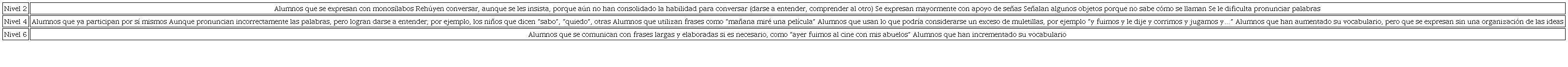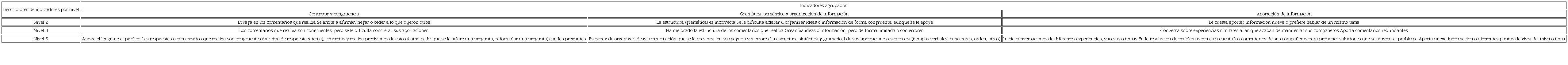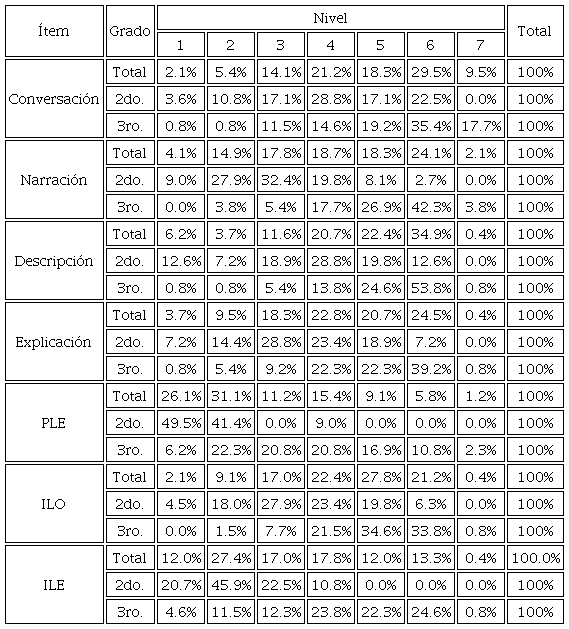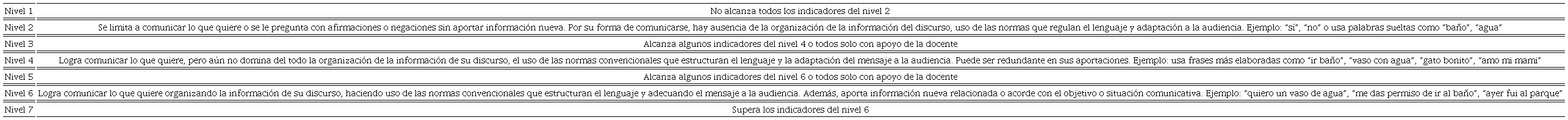 Los ítems de la rúbrica tienen siete niveles de desempeño, tres de ellos con descripciones sintéticas del desempeño. La tabla 5 muestra un ejemplo del ítem referente a conversación. El nivel uno se utiliza para ubicar el desempeño de un alumno cuando no cumple por completo con los criterios establecidos en el nivel dos. Los niveles pares dos, cuatro y seis contienen descriptores del nivel de desempeño de forma ascendente. Se emplean para ubicar el desempeño del alumno solo si cumple por sí mismo y sin apoyo con todos los criterios determinados en el nivel. Los niveles impares tres y cinco sirven para ubicar el nivel de desempeño del alumno cuando ha superado los descriptores del nivel anterior, pero no cumple por completo con los descriptores del nivel sucesivo, o cuando los cubre totalmente solo con apoyo del docente.
