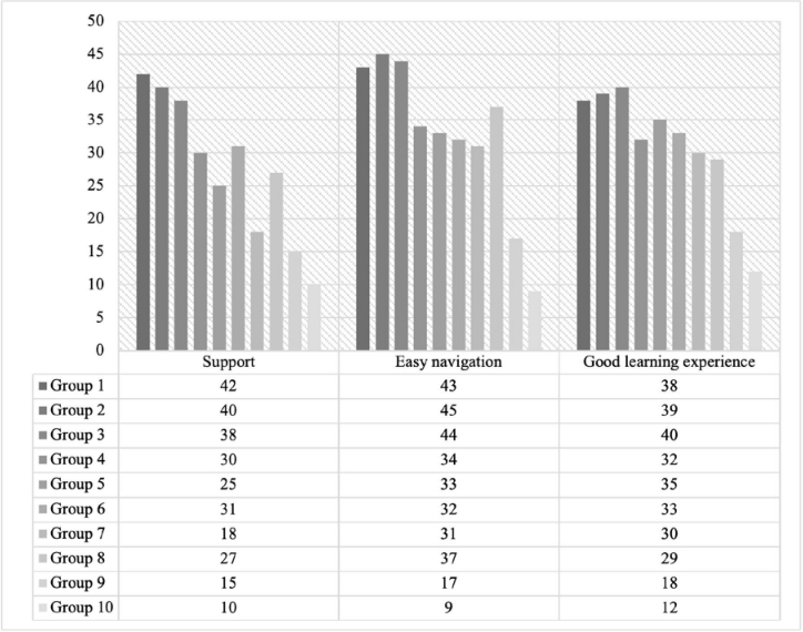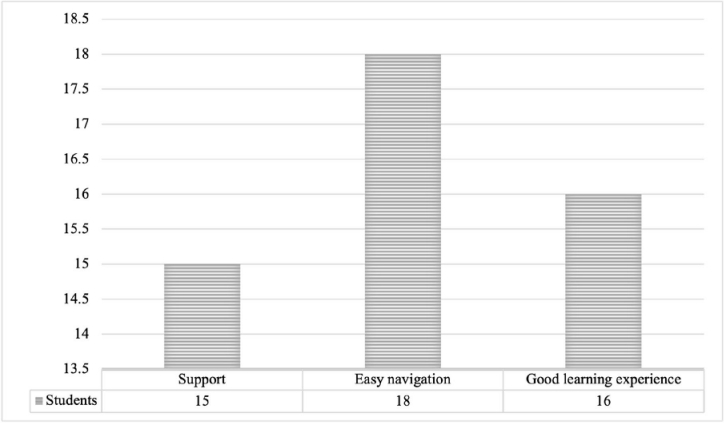 Three main categories were identified during the analysis of the in-depth interviews: support, easy navigation, and good learning experience.
