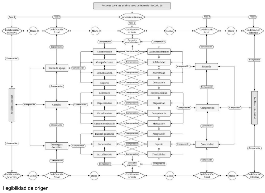 Resumen: El objetivo fue analizar las acciones resilientes que desarrollaron docentes de educación básica, tanto de manera individual como colectiva, para la atención de sus estudiantes y familiares durante la educación a distancia derivada de la pandemia a causa de la COVID-19. El estudio se apoya en la teoría fundamentada como herramienta de análisis y en entrevistas en línea y telefónicas a veinte docentes de educación básica de ocho estados de la república mexicana. Los principales hallazgos se dividen en: a) resiliencia grupal, que incluye la conformación de redes de apoyo con distintos sectores de la comunidad que sirvieron para dar continuidad a las actividades académicas; las acciones de gestión que directores y docentes realizaron para atender el reto de habilitación tecnológica y la atención a las constantes demandas administrativas; las estrategias innovadoras que implementaron de manera emergente para mantener la comunicación con estudiantes y padres de familia; y b) resiliencia individual, que comprendió estrategias de contención emocional; el desarrollo de una rápida adaptación y renovación de su práctica; el apoyo a través de la empatía y acciones solidarias; la conformación de acciones creativas en zonas rurales e indígenas sin mediación tecnológica; y las consecuencias negativas para los docentes, como agotamiento físico y emocional.