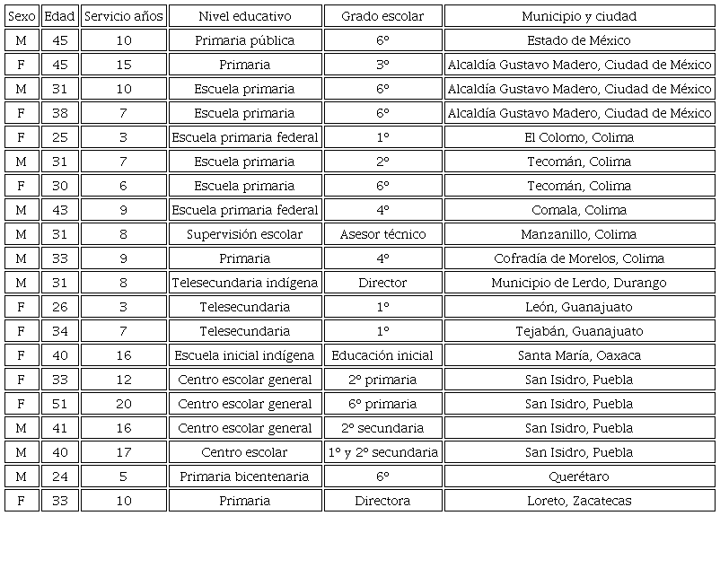 En un primer momento, la elección de los sujetos de estudio fue de manera intencional con base en tres criterios básicos: que trabajaran en los niveles de preescolar, primaria o secundaria; desarrollaran funciones de docencia, dirección o asesoría técnica; y con un mínimo de tres años de servicio en el sector público. La muestra quedó compuesta por 20 profesores, 10 de sexo femenino y 10, masculino, que residen en los estados de Colima, Guanajuato, Querétaro, Puebla, Zacatecas, Oaxaca, Durango y Ciudad de México, cuyas edades oscilan entre los 30 y 51 años; dos de ellos cumplen la función de directores, uno es asesor técnico y el resto se dedica de manera exclusiva a la docencia. La mayor parte de ellos trabaja en escuelas de educación regular, telesecundaria y educación indígena.