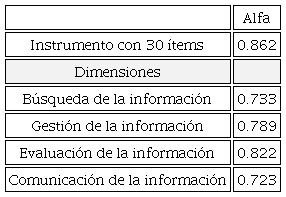 Partiendo del objetivo general, diseñamos y validamos un instrumento para evaluar la competencia informacional autopercibida con una muestra de 1,260 participantes de IES públicas y privadas en México. La adaptación del cuestionario fue probado satisfactoriamente al mostrar consistencia interna en cada una de las dimensiones analizadas y el global del instrumento, lo que permite resumir como fortalezas del cuestionario un alto grado de validez y confiabilidad.