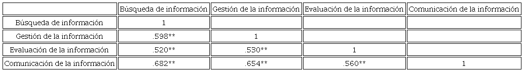 Por último, la dimensión comunicación de la información se correlaciona fuerte y positivamente con un nivel de significancia a nivel 0,01 con las dimensiones de búsqueda de información (.682), gestión de la información (.654) y evaluación de la información (.560).