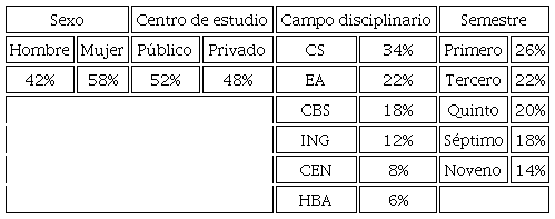 La muestra total se conformó de 1,260 participantes de centros de educación superior públicos y privados en el noroeste de México, seleccionados mediante el método probabilísticos por muestreo estratificado. Este tipo de muestreo permite que aumente el grado de representatividad; asimismo, posibilita una muestra más pequeña y un análisis más preciso del universo de estudio acorde con las variables de la investigación (Muñoz, 2015). En nuestro caso, subdividimos el número de participantes en elementos de marcos por estratos considerando el sexo, el tipo de centro universitario, área disciplinaria y semestre.
