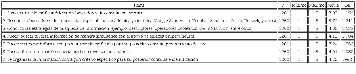 La dimensión de búsqueda de información de la CIA (véase tabla 2), en términos generales, evidenció en sus medias un nivel de moderado a relativamente alto (3.24 a 4.23). El ítem que mostró la media más alta en esta dimensión (4.23) refiere a la capacidad para organizar la información con algún criterio específico para su posterior consulta e identificación, mientras que la media más baja (3.24) fue “Puedo recuperar información previamente identificada para su posterior consulta y tratamiento de esta”.