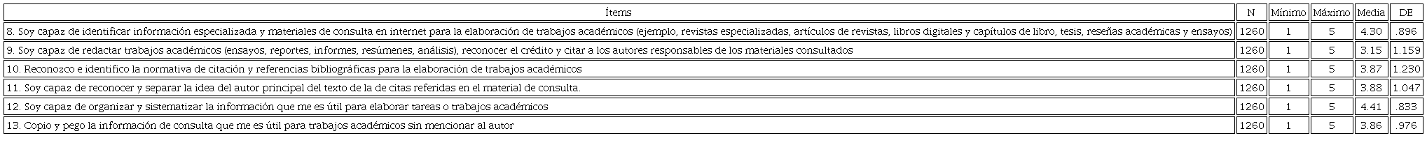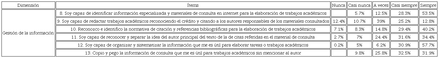 Por su parte, la dimensión de GI está integrada por seis ítems. Esta escala evidencia los trabajos realizados en otros contextos por Pinto (2009) y Pinto y Guerrero (2017), los cuales dan cuenta de la habilidad para seleccionar información especializada, conocimiento en la normativa de referencias y citación y, por último, habilidad para el tratamiento y organización de la información recabada.