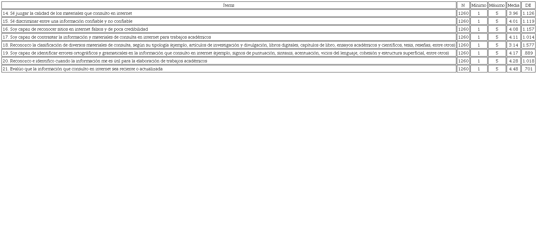 El análisis de la dimensión de evaluación de la información (véase tabla 4) reveló medias moderadas a altas en su mayoría (3.14 a 4.48). El ítem con la media más baja de la escala (3.14) fue “Reconozco la clasificación de diversos materiales de consulta, según su tipología, como artículos de investigación y divulgación, libros digitales, capítulos de libro, ensayos académicos y científicos, tesis, reseñas, entre otros”. Por su parte, el ítem “Evalúo que la información que consulto en internet sea reciente o de actualidad” presentó la media más alta (4.48) de esta dimensión.