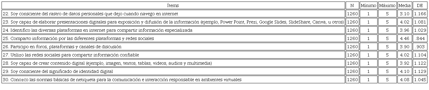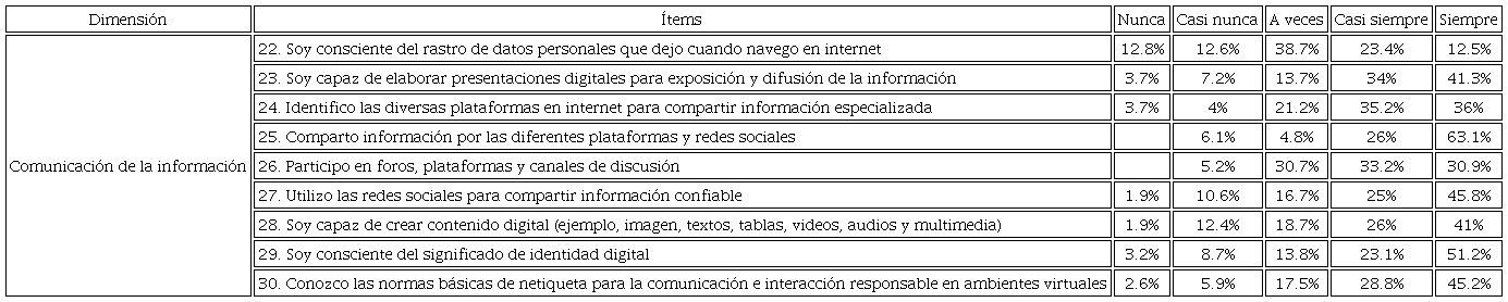 Respecto a la dimensión de comunicación de la información (véase tabla 5), el análisis presentado refleja datos muy similares a la dimensión anterior, al mostrar medias moderadas a altas (3.10 a 4.46). El ítem que evidenció la media más baja (3.10) fue “Soy consciente del rastro de datos personales que dejo cuando navego en internet”, mientras que el ítem “Comparto información por las diferentes plataformas y redes sociales” exhibió la media más alta en esta escala (4.46).