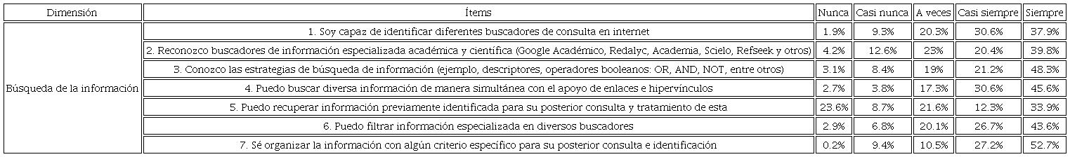 En una primera radiografía (véase tabla 6) mostramos los datos descriptivos más alusivos a algunos ítems de la dimensión de búsqueda de información. En primer lugar, con un 68.5%, los participantes en el estudio se autoperciben como capaces de identificar diferentes buscadores de consulta en internet y, con un 60.2%, se consideran hábiles para reconocer buscadores especializados con información académica y científica, al responder casi siempre y siempre. En segundo lugar, con un 20.3%, se ubica el grupo de estudiantes que, a veces, se considera capaz de identificar diversos buscadores y, con un 23%, están los estudiantes universitarios que, en ocasiones, logran reconocer los buscadores que contienen información especializada. En tercer lugar se encuentra un reducido grupo de estudiantes universitarios que, con un 11.2%, se perciben a sí mismos incapaces de identificar buscadores de consulta general en internet, al responder casi nunca y nunca, mientras que un porcentaje más elevado, 16.8%, se consideran no hábiles de identificar los buscadores de consulta especializada.