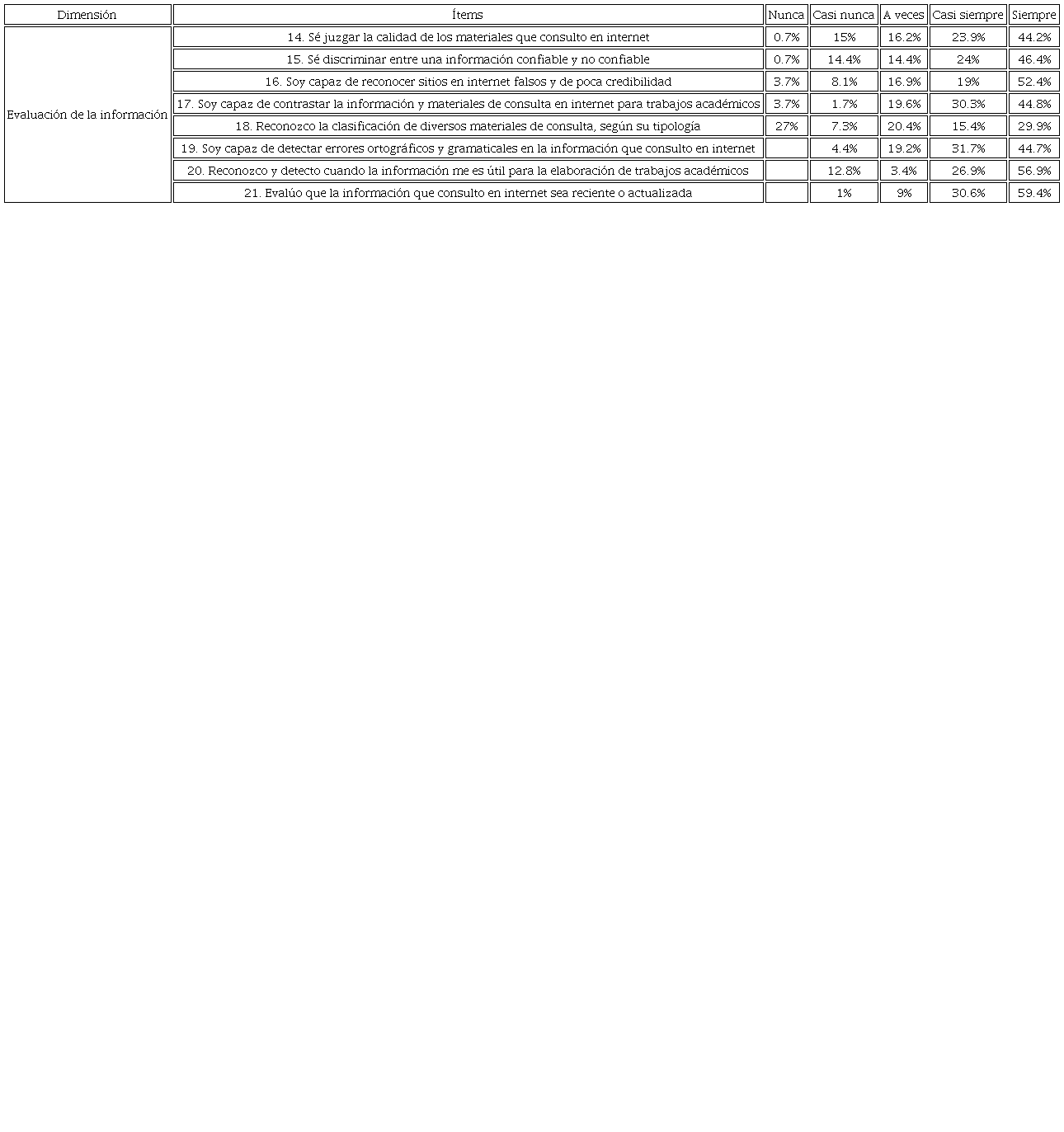 En concordancia con lo anterior, por cuestiones del espacio editorial presentamos los datos descriptivos más representativos en esta dimensión. La evaluación de la información (véase tabla 8) evidenció que un 90% de los participantes se consideraron capaces de evaluar la actualización de la información que consultan, al responder casi siempre y siempre, mientras que un 9% afirmó que, a veces, es capaz de analizar la información reciente de los materiales y solo un escaso 1% respondió que es incapaz de evaluar la actualización de la información. La gran mayoría de los estudiantes universitarios son altamente capaces de analizar y evaluar la actualidad de la información consultada. Asimismo, los estudiantes se perciben a sí mismos como capaces para reconocer cuando la información les es útil para la elaboración de trabajos académicos, al reflejar un dato sumativo del 83.8% de las escalas casi siempre y siempre. Otro grupo de estudiantes, con 3.4%, se asumen en ocasiones como hábiles para identificar la utilidad de estos materiales, y un 12.8% de la población en estudio es incapaz de reconocer la utilidad de los diversos materiales para los trabajos académicos.