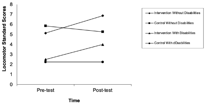 Regarding groups, the post-hoc tests showed no significant difference between the intervention with disabilities (M = 2.50, SD = 2.07), and the control with disabilities (control with disabilities: M = 2.25, SD = 1.76) groups at pre-test (p = 0.75). However, at the post-test the intervention with disabilities group (M =4.00, SD = 2.26) demonstrated higher scores (p = 0.05) compared with the control with disabilities group (M = 2.25, SD = 1.76). Furthermore, at the pre-test there was no significant difference (p = 0.20), between the intervention without disabilities (M = 5.13, SD = 2.07) and the control without disabilities (M = 5.86, SD = 1.94) groups; at the pos-test the intervention without disabilities group (M = 6.87, SD = 1.91) demonstrated significant higher scores (p ≤ 0.001) compared with the control without disabilities group (M = 5.27, SD = 1.56). Graphic 1 present the locomotor scores by groups from preto post-tests.